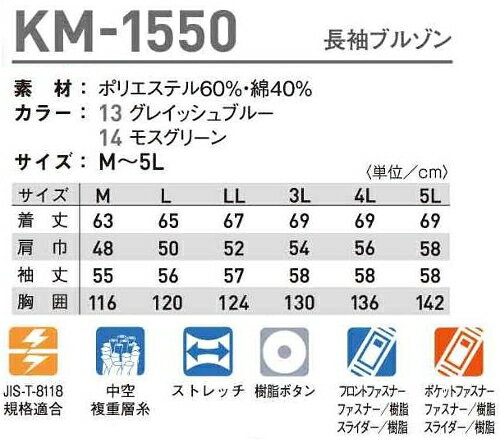 静電気・帯電防止ウェア スペック メーカー タカヤ商事 品番/シリーズ KM-1550/KM-1550シリーズ シーズン 秋冬物 ※このシリーズの春夏対応シリーズはコチラ 商品名 長袖ブルゾン 素材 ポリエステル60%・綿40% カラー 13:グレイッシュブルー 14:モスグリーン サイズ M〜5L ※3L以降は割り高になります。